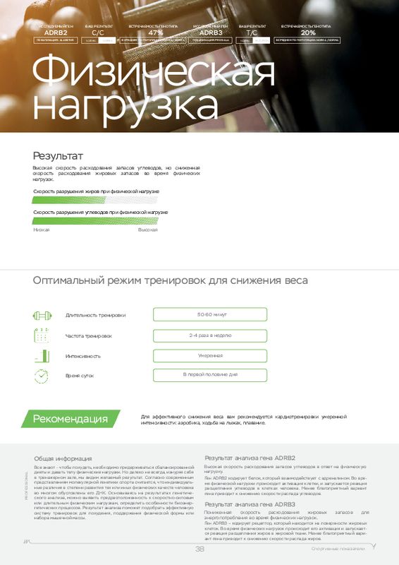 Этот ДНК анализ показывает, к каким физическим нагрузкам человек расположен генетически, а также какие продукты (содержащие определенные элементы) лучше употреблять в пищу. У каждого человека свои цели, кто-то хочет просто сбросить лишний вес, кто-то увеличить силу мышц, а кто-то нарастить огромные мускулы. Для получения максимальной отдачи от тренировок мы рекомендуем пройти наш генетический тест для фитнеса в Биробиджане.