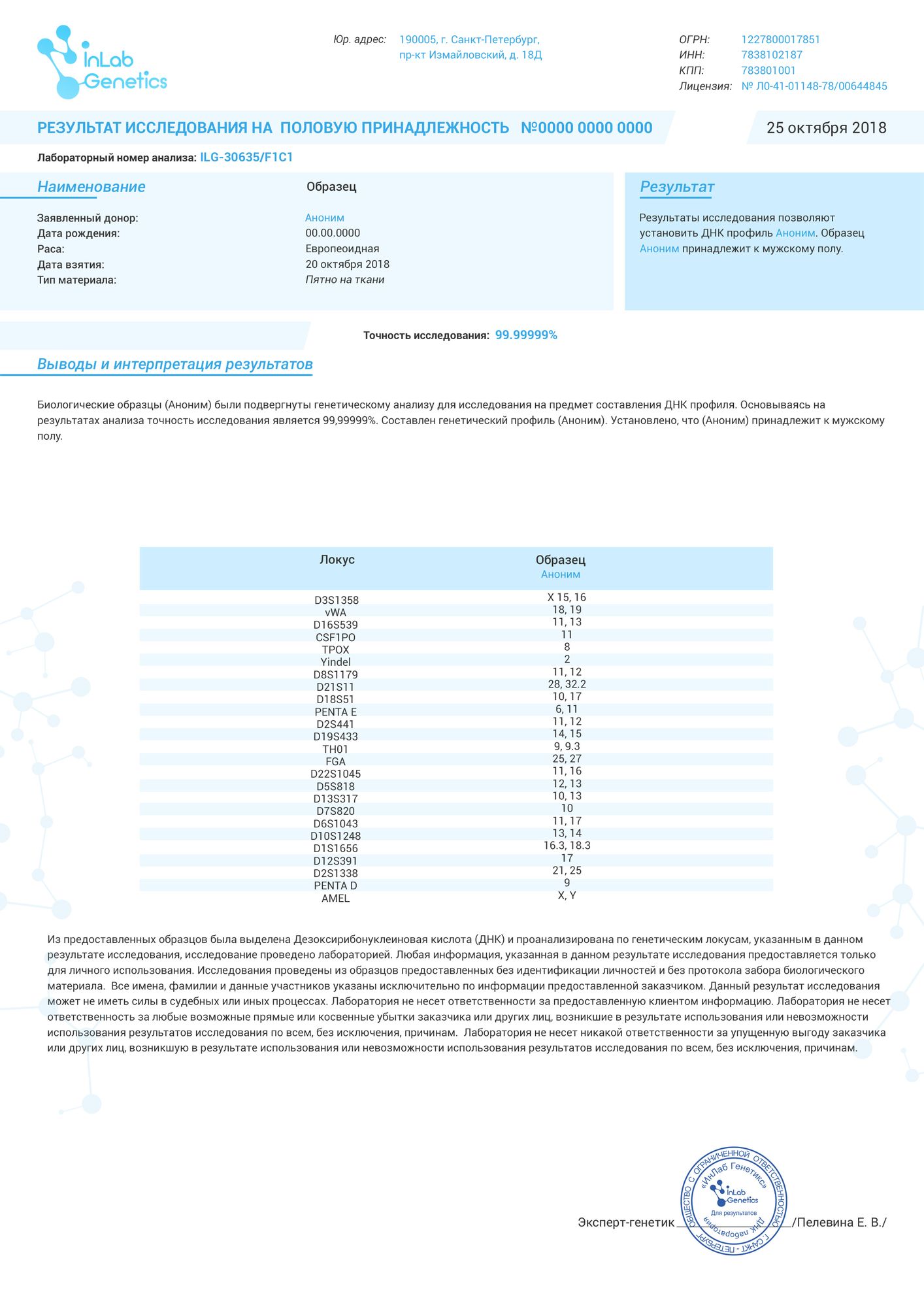 Анализ поможет определить пол анализируемого образца. Если вы, к примеру, обнаружили подозрительное пятно на одежде мужа, а оказалось, что оно женское, возможно, что это ваше пятно. В таком случае, путем сравнения ДНК пятна и вашего ДНК, мы сможем предоставить неопровержимые доказательства.